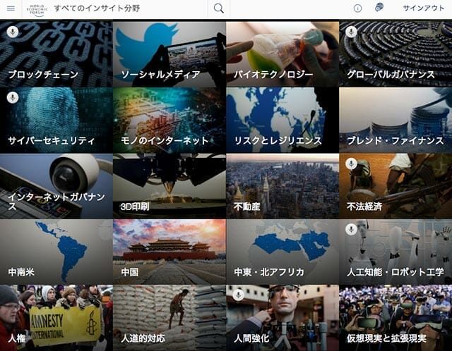 世界経済フォーラム(WEF)が持つ集合知を活用するナレッジツール「変革マップ」があります。日本の重要課題では、「人的資本と労働改革」「グローバルリーダーシップと国家安全保障」「資源不足」「不平等と成長の理解」「長寿(高齢化)」の5分野/課題を挙げて、直感的に理解しやすいグローバルな「変革マッピング」を作成して公開しています。多言語版(英語、ポルトガル語、中国語、スペイン語、アラビア語、日本語)で公開されていましたが、最近、翻訳が進み日本語版が充実してきたようです。