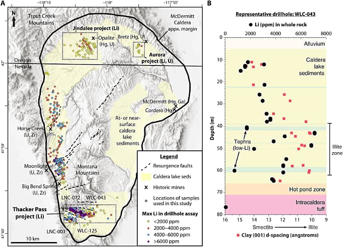 その後、クレーター内に「湖」が形成され、何十万年も存続して風化した火山と周囲の物質が湖の底に粘土を多く含む堆積物を形成しました。新しい分析では、湖が空になった後に別の火山活動により堆積物がリチウムとカリウムを豊富に含む高温のアルカリ性塩水にさらされたことを示唆しています。「これまでの研究では、イライトはカルデラのどこにでもある深さまで存在すると推測しており、高温高圧によってスメクタイト(Smectite)がイライトに変化した」と述べています。