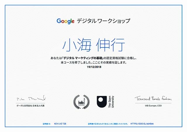 Googleのデジタルワークショップは、検索の仕組みやソーシャルメディアの活用方法など、デジタルマーケティングの基礎を動画で分かりやすく学べます。私は2017年7月から初めたのですが、中途で何度も中断してしまい、12月19日にようやく修了して認定書を取得できました(^^) 「デジタル マーケティングの基礎」の認定証取得コースでは、26のモジュール(40時間)があり26個のバッジが取得できました(^^)
