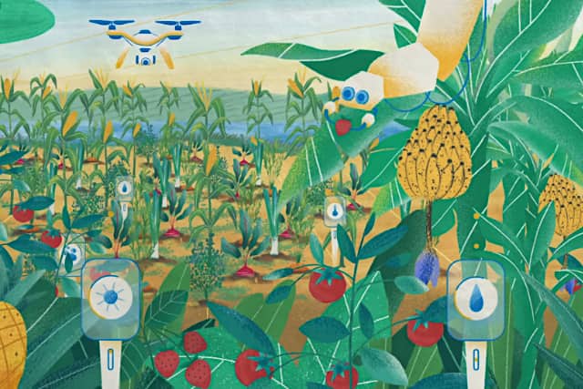 その結果、野生の動植物を根絶させ、大量の温室効果ガスを排出しました。その被害を是正しようというのが、この新しい農法です。作物の間を移動するのは農業用ロボットです。適正量の肥料を散布します。土の中には、何百ものセンサーが設置され、養分と水分のデータを集めます。このデータをもとに、不要な水の使用を削減したり、どの箇所の施肥料を調整すべきかを判断します。農地全体に肥料を散布する汚染を防ぐのです。