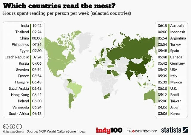 国民一人当たりの一週間の平均読書時間は、上位から、インド(10:42)、タイ(9:24)、中国(8:00)、フィリピン(7:36)、エジプト(7:30)、チェコ(7:24)・・・です。アジア人は地球上で最も情熱的な読書家です。しかし、日本は「4時間06分」で上位3国の半分ほどしかありません。オンライン化している米国で「5時間42分」あります。
