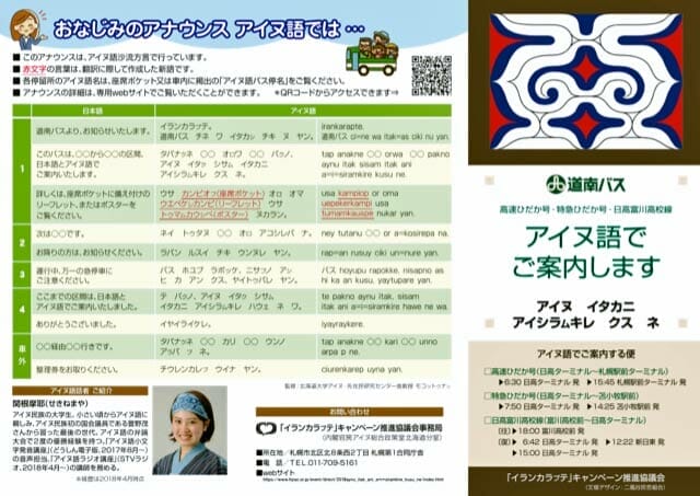 2018年4月から、アイヌ語の復興・普及に向けて、より多くの方がアイヌ語にふれ、身近に感じてもらえるようにアイヌ語による車内アナウンス(道南バス)を実施しています。