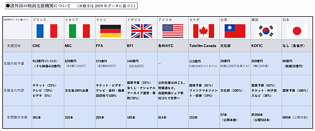 2022年6月1日に設立された「日本版CNC設立を求める会」(action4cinema)は、フランスのCNC/fr(国立映画映像センター)に相当する統括機関をモデルとしたもので、コンテンツ産業の未来を拓くために、「製作支援」「流通支援」「教育支援」「労働環境の保全」という4つの支援を柱に新たな「共助システム」の構築を業界内に求めるものです。停滞しているコンテンツ産業の未来を切り拓いてほしいと思います。KOFIC(Korean Film Council)とは、韓国映画振興委員会です。