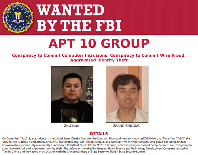 米司法省とFBIは「男性 Zhu HuaとZhang Shilongは、Advanced Persistent Threat 10(APT10)と呼ばれるグループの一員で、中国政府に関連するハッキンググループです。2006年から2018年にかけて、米国企業を含む45以上の組織からの情報を盗む広範なハッキング行為を実施した。医療、バイオテクノロジー、金融、製造、石油・ガスなどの多様な業種の企業から、密かに数百ギガバイトの機密データを取得した」と述べています。