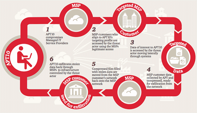 今回確認されたスパイ行為は、マネージドITサービスプロバイダ(MSP)を標的としたものです。APT10は、この攻撃によって世界中の MSPに加え、その顧客の知的財産や機微性のある情報に対して、空前規模のアクセスを手中にしたと考えられます。彼らは、ほんの2~3件の MSPを標的とした間接的アプローチで、そのMSPが抱える多くの顧客に到達しようとしました。