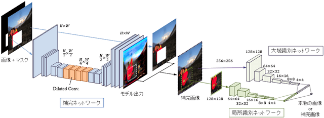 実際の画像補完に使用するのは補完ネットワークのみであり、2つの識別ネットワークは補完ネットワークの学習のために使用されます。補完ネットワークはすべての層が畳み込み層で構成、補完対象の損失領域を定義したマスクと画像が入力されると、損失領域が補完された画像が出力されます。損失領域以外の領域は入力画像に置き換えることで最終的な補完画像が得られます。