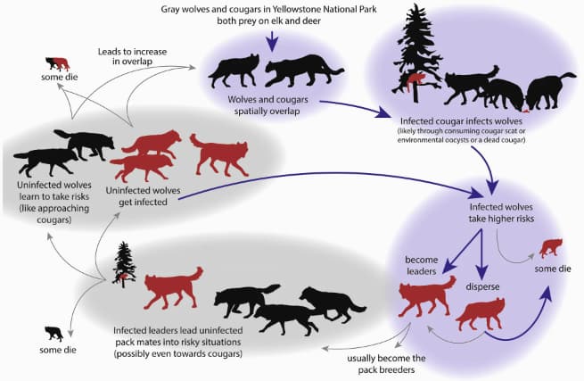 トキソプラズマ原虫に感染した群れのリーダーが、ピューマの生息地と重複する高リスク地域に群れを誘導する可能性があるため、トキソプラズマ原虫感染が、イエローストーン国立公園のハイイロオオカミの個体群に幅広い影響を及ぼす可能性があるという考えを示しています。このことは、未感染のハイイロオオカミの感染リスクを高め、さらなる危険な行動を引き起こすフィードバックループを形成する可能性があるということです。(感染:赤色/下図参照)