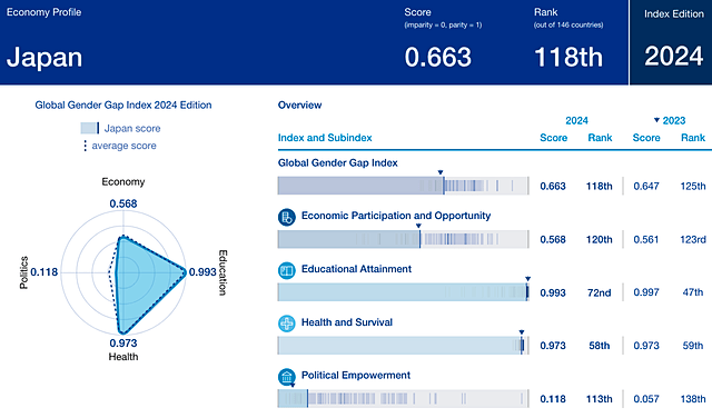世界経済フォーラム(WEF)は、6月12日に世界男女格差指数(Global Gender Gap Index)の2024年版を発表しました。これは政治参加、経済、教育、それに医療へのアクセスの4分野14項目のデータを基にして、各国の男女の格差を分析した指数です。日本は、調査対象となった世界146カ国のうち118位(2023年は125位)となり、昨年から順位を上げましたが、先進国最低水準に留まっています。分野別(昨年順位)では政治参加は113位(138)、経済が120位(123)、教育は72位(47)、医療は58位(59)です。日本経済の長期低迷(日本病)、改善しない少子化、幸福度ランキングの低さの最大要因です。