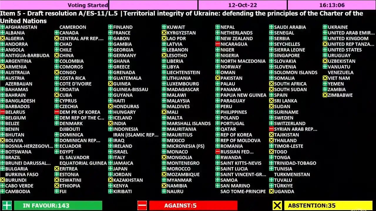 - With 143 Votes in Favour, 5 Against, General Assembly Adopts Resolution Condemning Russian Federation’s Annexation of Four Eastern Ukraine Regions(10/12 UN)