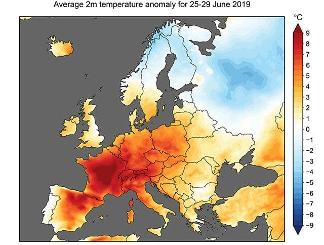 長期的な観点から気温データを見ると、月単位ではさらに異常であることが分かります。最新のデータを過去の期間に拡張されたデータセットと結合すると、2019年6月の欧州の平均気温は1850-1900の平均より3度以上高かったことが分かります。