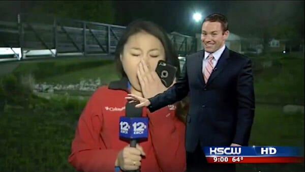 米カンザス州ウィチタにあるテレビ局 KWCHで ROSS JANSSENさんが、ニュース番組のコーナーで天気図を指差して解説していましたが・・。