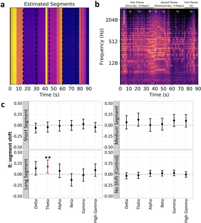 「モーツァルトK448」の長い繰り返しの部分が終わるところを聴いた被験者の前頭皮質では、電気的活動の一種であるシータ活動(シータ波)が増加しています。シータ活動は、音楽に対するポジティブ感情を伴う応答との関連が示唆されています。