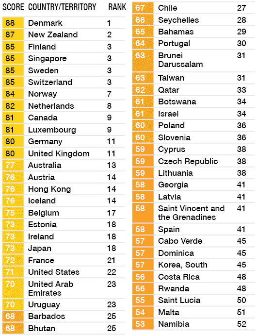 2016年の腐敗認識指数は、最もクリーンな国がデンマークとニュージーランド(1位/スコア90)となり、続いて3位フィンランド、4位スウェーデン、5位がスイスとなりました。*米国のスコア低下が目立ちます(2019年順位22位)。