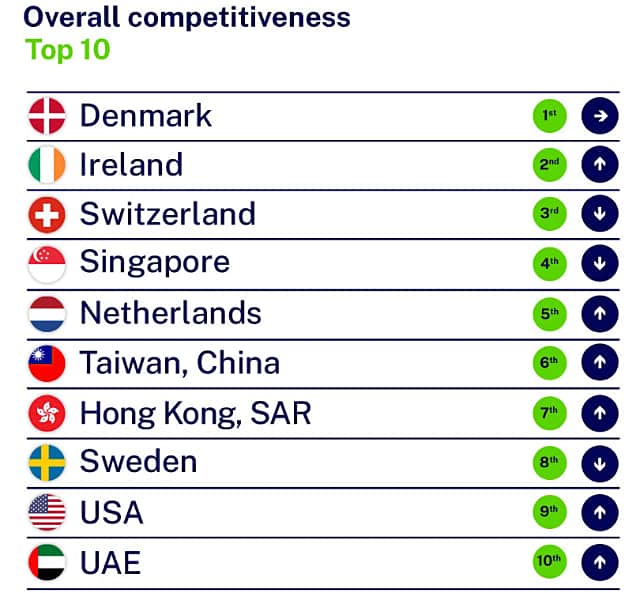ランキングトップ3の国は、いずれも小規模経済国であり、市場や貿易相手国へのアクセスをうまく活用しています。4位のシンガポールも同様です。アイルランドの急上昇は主に、優れた「経済パフォーマンス」の結果(7位から1位)であり、総合では11位から2位に上昇しています。