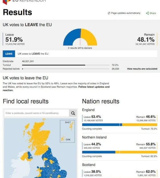 英国の欧州連合(EU)離脱の是非を問う国民投票(United Kingdom European Union membership referendum)は、2016年6月23日に実施され全国382ヵ所の開票所の開票作業の…