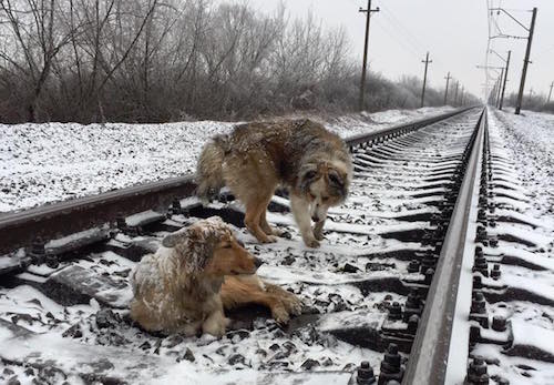 この写真と動画は、ウクライナ西部のウージュホロドで撮影されたもので、デニス・マラフェエフ(Denis Malafeev)さんという男性が、自身の Facebookに投稿したものです。 雪の積もった線路の真ん中に2匹の野良…