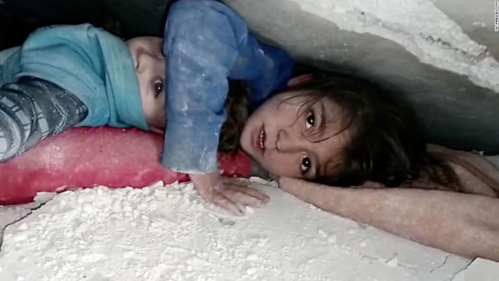 トルコ南東部を震源とする大地震(2023 Turkey–Syria earthquake)で大きな被害を受けたシリア北部のハラム(Harem, Syria)で、がれきの下敷きになっていた幼い姉妹が36時間後に無事救出され…