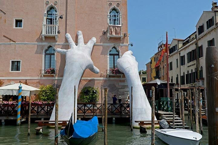 地球温暖化による海面上昇で、街が沈むとも言われている水の都ベネチア。5つ星ホテルのカサグレドホテル(Ca’ Sagredo Hotel)を支えるこの巨大な手は、イタリア人アーティストのロレンツォ・クイン(Lo…