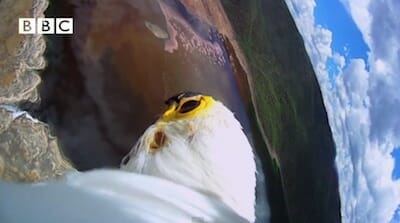 「鳥から観た映像の世界」。 鳥の眼から見た光景だけでなく、映像フレームに鳥自身も映ります。ぐるりと見渡せる景色に鳥の翼までも映り込み、驚異の映像になっています。 撮影したのは、映画・テレビ製作者の John Downer…