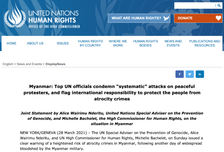 3月28日、ミシェル・バチェレ(Michelle Bachelet)国連人権高等弁務官とアリス・ワイリム・ンデリトゥ(Alice Wairimu Nderitu)ジェノサイド防止に関する国連特別顧問は共同声明を発表しまし…